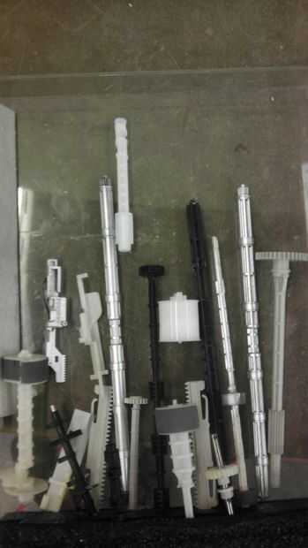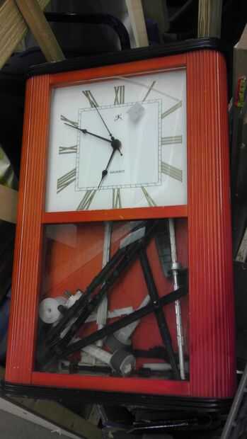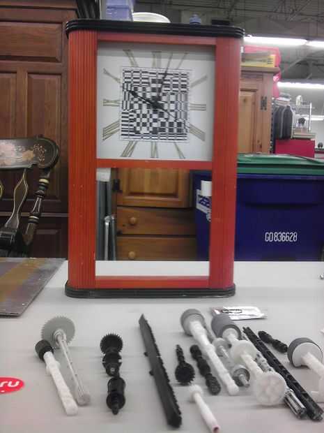Además de engranajes, correas y resortes, las impresoras están llenas de interesantes piezas de plástico que quería adherir a lo largo de una tira fina de madera dentro del reloj. Aerosol pintado algunos plata. El pedazo pelado rojo vino de un osciloscopio realmente muy viejo que fue aprox. 3' x 4' en tamaño! (ver foto 1). Hice un collage de negro sobre la cara del reloj y también pintó la pieza posterior en rayas oro y plata.