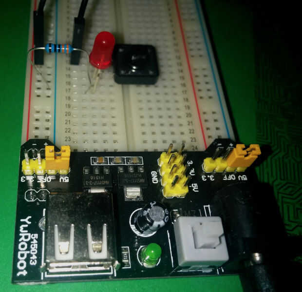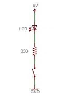 Así que vamos a construir nuestro primer circuito DC en el protoboard sin soldadura. Permite que el circuito en el esquema actual para fluir de una fuente de 5 VDC a través de un LED (diodo electroluminoso), a través de un resistor, a través de un interruptor y finalmente a tierra. Por supuesto la corriente sólo fluye cuando el interruptor está cerrado o presiona. El LED sólo funciona en una dirección. Si no enciende al cerrar el interruptor, trate de alrededor de los bancos.