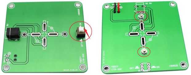 El botón de encendido y el terminal de alimentación a la placa Base de la soldadura. Al insertar el botón de encendido, el lado muescado de la tecla debe enfrentar el borde más cercano de la PCB tal como se muestra. Un pedazo de plomo de resistencia que fue cortado antes puede envuelto alrededor de terminal de potencia y soldado a la placa como un relieve de la mancha para hacer el conector más robusta al insertar el enchufe de alimentación.