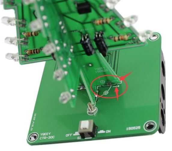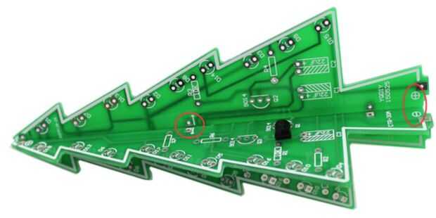 Deslice las mitades de dos árboles en uno otro cuidando de doblar a cualquiera de los componentes (tales como los transistores) nuestro de la manera si capturan a uno con el otro. Una vez que se alinean los lados, soldar las pastillas juntas donde tocan las mitades. Ahora el LED (D19) puede ser conectado y recortado. Por último, introducir el árbol en el PWB de la base teniendo cuidado de observar el "+" y "-" las designaciones en todos tres los PCBs. soldar el árbol a la placa base.