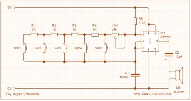 Este proyecto muestra cómo construir un simple órgano clave de cinco juguetes usando la 555 viruta de temporizador. Aquí están algunos ejemplos de este circuito incluyendo videos.