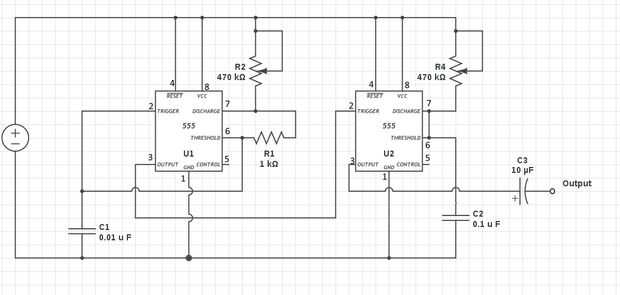 Atari Punk Console (APC) requiere dos chips de Temporizador 555, así que a veces verá diseños utilizando un solo temporizador dual 556 de la viruta, que es básicamente 555s sólo dos en un solo paquete. La APC, técnicamente se denomina un generador del tono caminado, recibe su nombre popular por el hecho de que sus sonidos "low-fi" se asemejan a juegos clásicos de consola de Atari del decenio de 1980. La APC funciona como un oscilador de onda cuadrada de astable conducir un oscilador monoestable, creando así un solo pulso cuadrado. El APC tiene dos controles de potenciómetro. Un potenciómetro controla la frecuencia del oscilador y el otro controla el ancho del pulso.