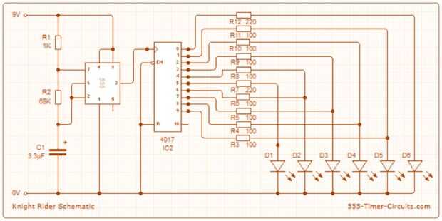Esta explicación y video ilustra la construcción de un analizador de la secuencia de LED con el temporizador 555. Este efecto fue visto en el coche KITT de la serie de televisión Knight Rider y también los cylon en el programa original de televisión Battlestar Galactica. En consecuencia, tales circuitos se refieren a menudo como el oscilador de Knight Rider o el oscilador de Cylon.
