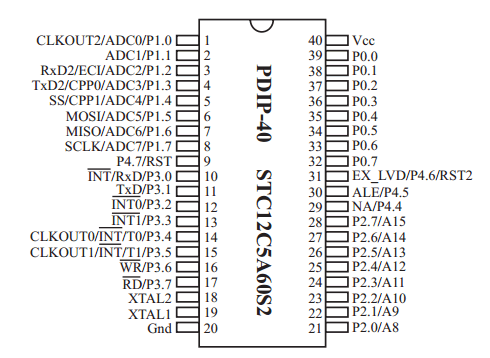 Si usted está interesado en la ingeniería reversa 4 x 4 x 4 cubo del LED, el microcontrolador se basa en el, una vez muy común, chip 8051 . La variante usada aquí es una STC12C5A60S2 (hoja de datos) en un paquete plástico de DIP de 40 pines.