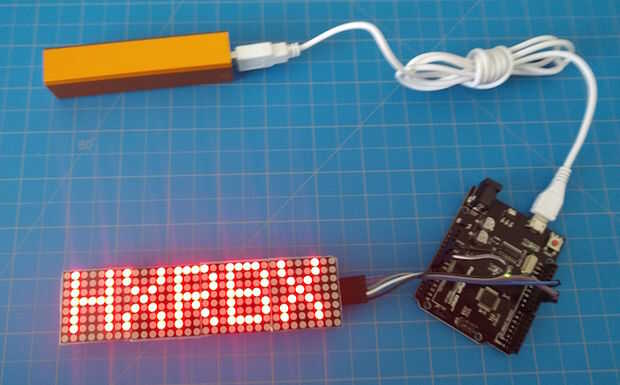 Hay cuatro módulos FC-16 (MAX_DEVICES) y los pines 10, 11 y 13 (junto a 5V y GND) son las que conectar de los FC-16 pines para el Arduino con algunos hilos de Dupont de hombre a mujer.