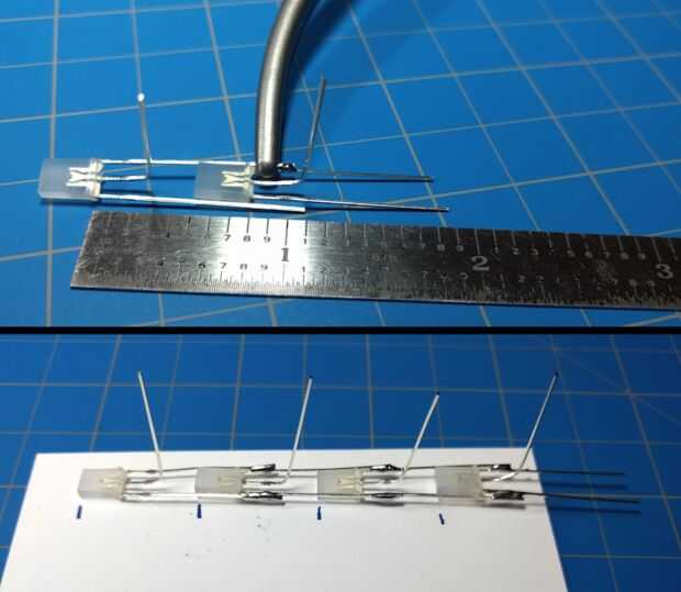 Los 64 LEDs rectangulares están dispuestos en 16 columnas de 4 LEDs, por lo que vamos a trabajar en grupos de cuatro. En primer lugar establecemos los cuatro LEDs con el pasador más corto (azul) a la derecha y la lente de plástico apuntado lejos. En esta orientación, doble el pasador mediano hacia arriba como se muestra. Esto evita que todos los LEDs frente a la misma dirección para mantener la polaridad rojo/azul.