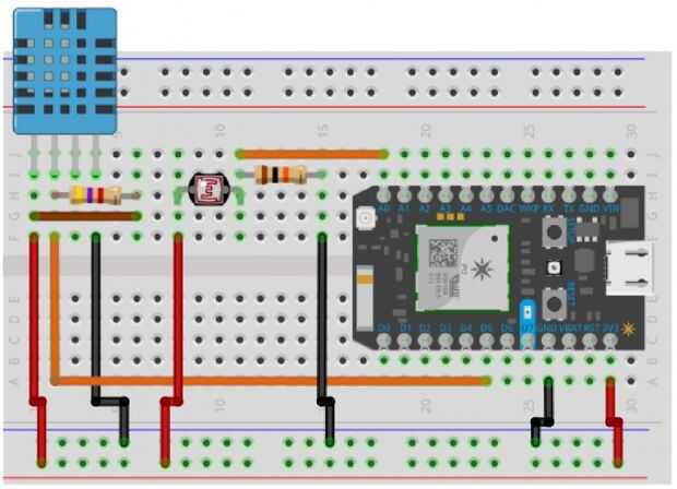 Este gran tutorial es de Open Home Automation. Datos ambientales es recopilados de algunas fuentes de sensor. Se trata de una célula fotoeléctrica y un DHT-11 (Digital de humedad y temperatura) (hoja de datos). Tenga en cuenta que la línea de datos de la DHT-11 necesita un resistor de "pull-up" conectado a Vcc (el tren de energía positiva). El esquema muestra una resistencia de 4,7 K para este pull-up, pero una resistencia de 10K funciona igual de bien.