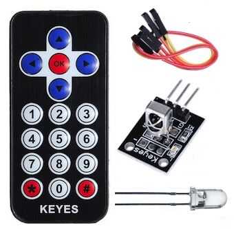 Un kit de Control remoto de infrarrojos (IR) se puede utilizar en un contexto de IoT para desencadenar eventos de IoT del mando a distancia IR (mediante el dispositivo de receptor IR) o para transmitir señales de IR utilizando el LED IR.