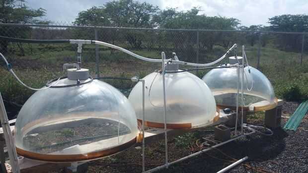 Bio-reactor domos - domos plástico 2 fueron pegados juntas para crear un biorreactor de bóveda. Se agregaron accesorios para transferencia de aire y el agua. Bajo cada cúpula es una matriz de led crece la luz de 300 vatios para la producción del tiempo de noche. El aire de los Biorreactores se bombea desde y hacia el hábitat para el secuestro de la generación de 02 y co2. Una el instructable sobre cómo usted puede hacer esto puede encontrarse aquí.