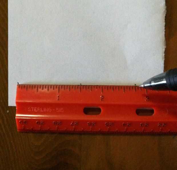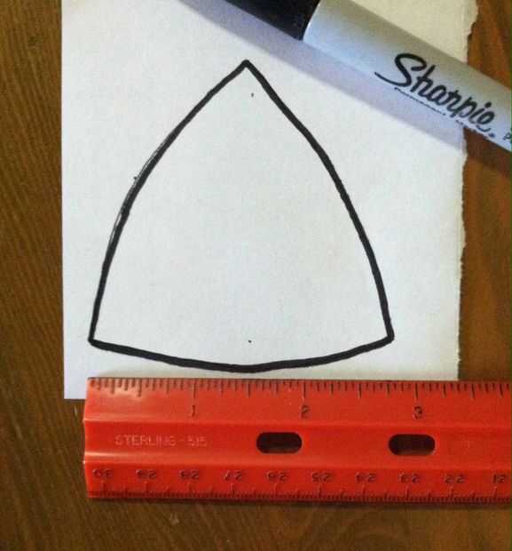 Utiliza una regla y marcado hacia fuera 2 3/4". luego marqué la mitad de eso en 1.5". desde este punto a mitad de camino, hice un estimado defina 2 1/2" marca y marcado hacia fuera un extra 1/4" para la curvatura. de una línea recta entre dos puntos, una curva se sumerge hacia fuera 1/4".