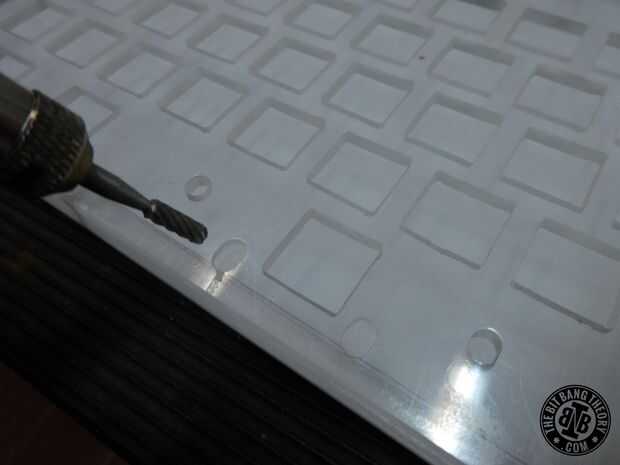 Para colocar los titulares de este clip de la capa superior, una vez más utilizar la Dremel para abrir algunos bolsillos en las posiciones aproximadas, coloqué los titulares clip dentro y lleno con resina epoxi. Para asegurarse de que los soportes de clip me alojé en la posición correcta, pienso montar los interruptores y teclas para estas teclas con los clips metálicos en el lugar mientras se secaba la resina de epoxy .