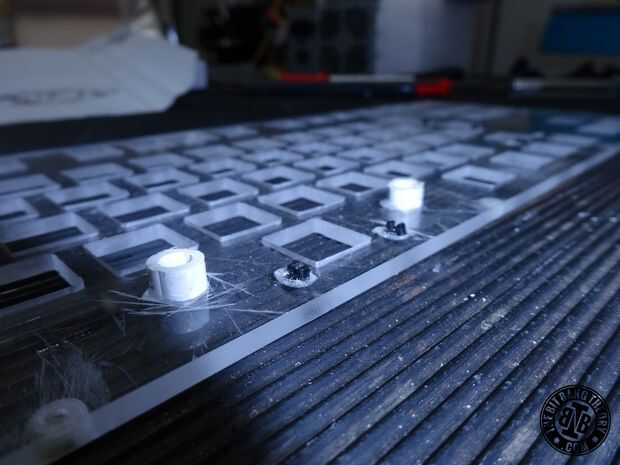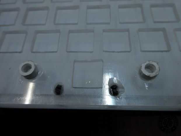Desde debajo de la barra de espacio para alinear piezas de plástico, también tuve que hacer a alguna pequeña guía tubos para ellos, que también se pegan con pegamento epoxi. Los tubos guía hicieron de alguna varilla de PVC perforado en el centro. Para asegurarse de que estaban pegados en el lugar correcto, puse la tecla barra espaciadora en lugar, pulsado un par de veces para alinear los tubos guía y luego deje que el pegamento secando. Una vez seco, quité la llave y el interruptor.