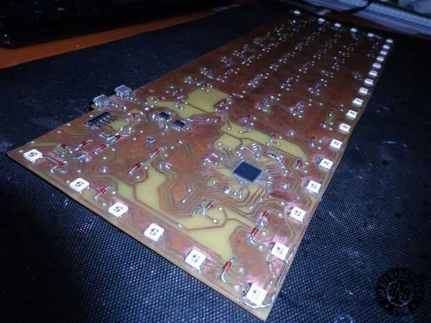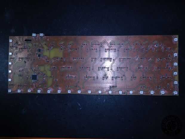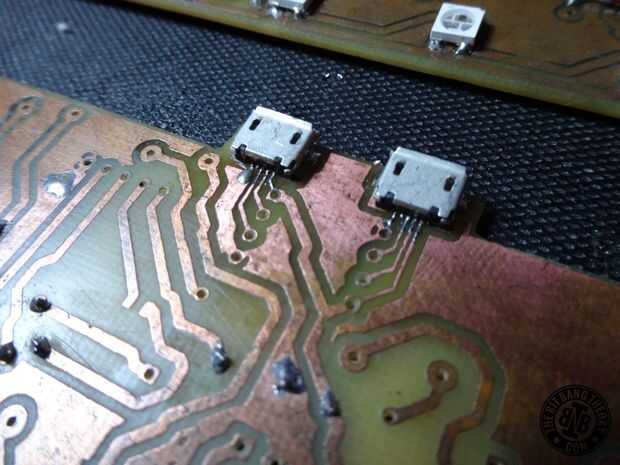 Ahora es el momento de soldar todos los componentes. Recomiendo tras las colocaciones de componente en el archivo KiCAD PCB a partir de los componentes SMD como procesador, eeprom, regulador de la bomba de carga, micro USB puertos, resistencias SMD y condensadores, LEDs WS2812B y sólo entonces proceder de los diodos y el conector de programación. Asegúrese de que los LEDs de WS2812B en la posición correcta de la soldadura desde theire orientación puede ser difícil de averiguar. Mire la hoja de datos para confirmar.