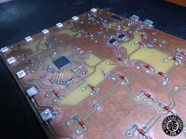Los diodos se deben soldar en ambos lados del PCB, ya que sus conductores se utilizan también para conectar huellas en ambos lados del PCB.