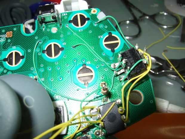 ¿Qué es un optoacoplador? Un optoacoplador es un poco de luz diodo colocado junto a un fototransistor en un paquete de viruta plástica. Aquí, estoy usando el 4n27, que es un dispositivo de 6 pines. Estoy usando el paquete de la inmersión, lo que significa es tamaño completo con los pernos a través del agujero. ¿Podría ahorrar mucho espacio utilizando un elemento de montaje superficial? Bueno, tipo de. Montaje en superficie principalmente reduce la altura de su circuito, en lugar de la anchura... especialmente teniendo en cuenta el circuito adicional que sería necesario. Como se verá si abren su controlador, no hay mucho espacio aquí, pero justo al sur del botón B, hay un espacio muy alto que podemos utilizar.