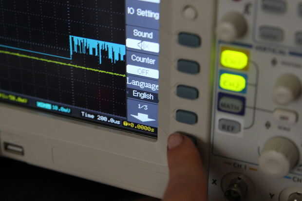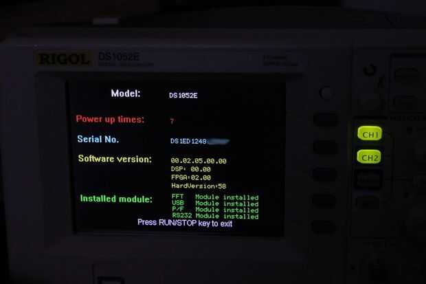 Como veis en la foto, le he metido el firmware 02.05.00.00 HardVersion 58. Puede obtener todos estos detalles entrando en la información del sistema cuadro de diálogo, pulsando CH1 dos veces, luego CH2 dos veces, luego matemáticas una vez. Solo ten mucho cuidado cuando haces esa secuencia - al parecer puede atornillar cosas para arriba si pulsas otra cosa que RUN/STOP en este punto.