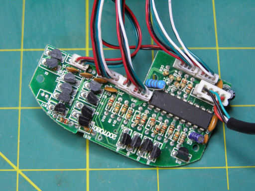 Tiene un IC que recibe órdenes USB desde la aplicación windows y salidas de voltajes de control en varias clavijas diferentes para controlar los motores, etc..