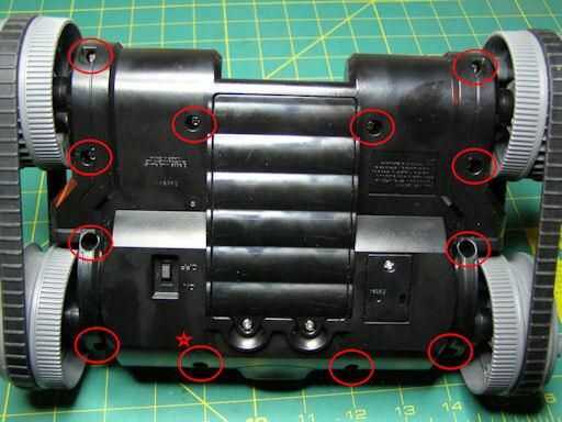 Doble la antena y luego se voltea el Trakr para que pueda llegar a los tornillos que sujetan el caso Trakr juntos. Utilice el destornillador para quitar los tornillos en un círculo en la imagen. El tornillo marcado con una estrella es más pequeño que el resto, recuerda poner en el mismo agujero cuando vuelva a montar el Trakr.