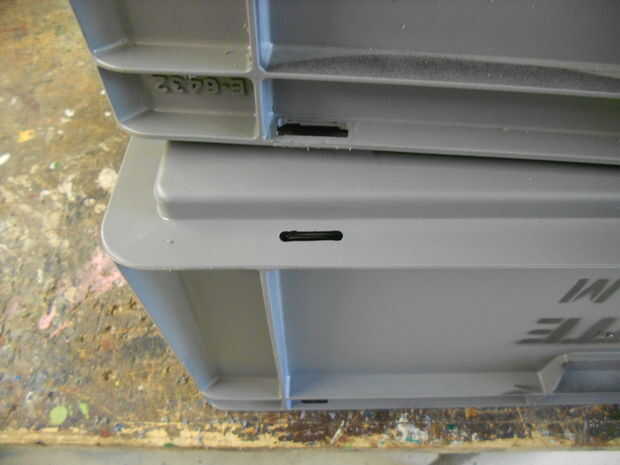 Para mantener las cajas de seguridad encima de la otra, hice algunos extra azotando las ranuras en el borde inferior, correspondiente a los que en el borde superior. Puse dos cajas encima de la otra y había marcado el terreno. Luego dos agujeros perforados y hacer dos cortes con la sierra para crear una ranura. Finalmente limpiaron todo con un archivo. Repita cuatro veces para cada caja.