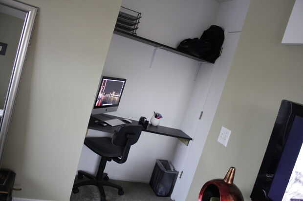 mi esposa y yo recientemente se mudó un apartamento nuevo, que es bastante más pequeño que antes. La mayoría de nuestras cosas no encajaba, incluyendo nuestro escritorio. Sin embargo, notamos rápidamente que no existía espacio muerto (espacio desperdiciado detrás de la puerta de la habitación principal cama. Había no hay tomas de corriente en esa zona, y hay muy poco espacio. De hecho, desde la puerta a la pared había solamente cerca de 12 pulgadas. Decidido a mirar alrededor para encontrar una mesa de fina, pero notó que nada iba a funcionar, así que esto es lo que nos ocurrió.