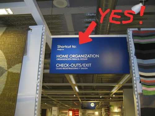 En IKEA, te mano un mapa (un mapa?!) como si eres Indiana Jones tratando de encontrar un templo oculto. Si usted necesita para llegar a algo en toda la tienda, lástima - tienes que ejecutar el guante de todos los departamentos entre. Heck, el día estaba allí, fueron remodelando algunas de las pantallas de cocina, tanto de ese departamento fue bloqueado, y al siguiente departamento (sillas de oficina) fue casi imposible. Tuve que ir a un departamento diferente en otro rincón de la tienda y dar marcha atrás (ir contra el flujo de tráfico) para encontrar la sección de muebles de oficina.