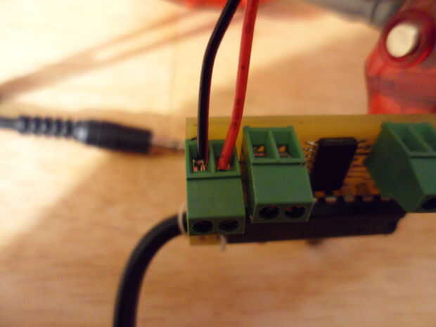 Conectar los cables a la ADMCB es fácil usando los terminales de tornillo de cabeza plana. Inserte los cables pelados en los orificios como se muestra y apriete el tornillo sobre el orificio con un destornillador pequeño de cabeza plana. Después de apretar, compruebe que no hay hilos de alambre de cobre se cortocircuitan entre sí.