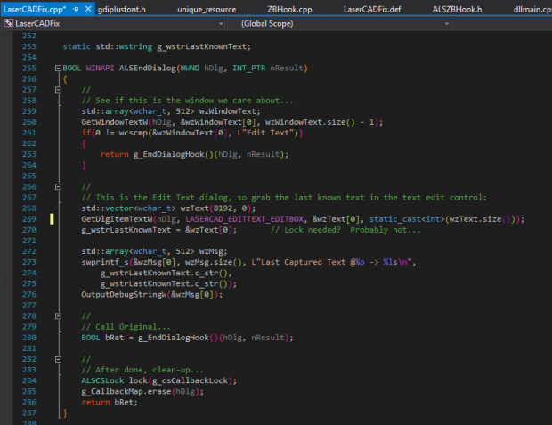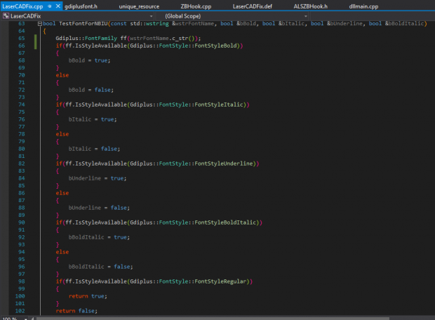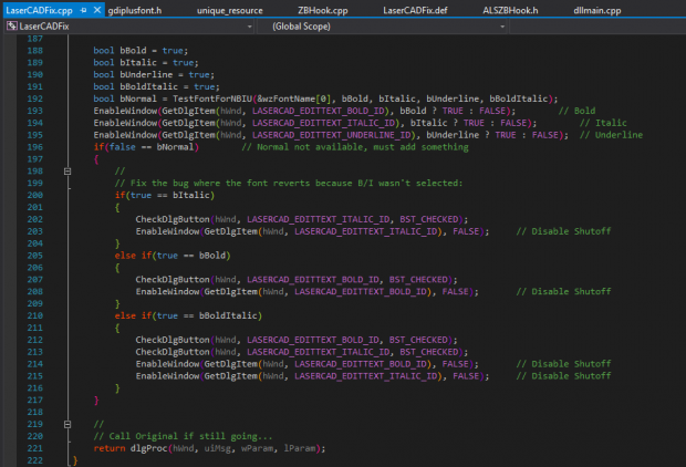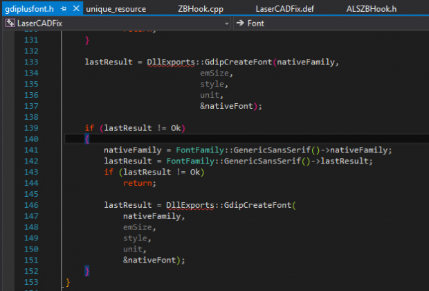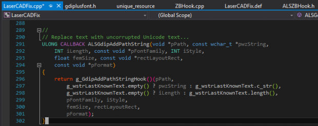 El último paso es conectar la función GDI + que se utiliza para representar el texto: GdipAddPathString. Cuando se invoca, simplemente reemplazar el texto que se pasa a ella con la cadena que guarda desde el control de edición. Lamentablemente, el texto que se aprobó a GdipAddPathString por LaserCAD que pueden convertir en una cadena Unicode antes de que podría ser enviado a GdipAddPathString, pero el daño ya había sido hecho. Aquí está mi reemplazo para GdipAddPathString: