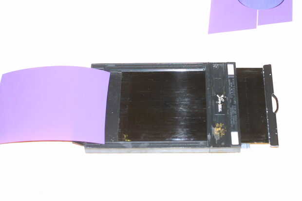 b. el interruptor. Para la película de gran formato, la película de 105mm simplemente puede ser picada en el formato correcto utilizando una cortadora de papel tipo guillotina grande. Para la película de duplicación sensible ortocromáticas o azul, puede hacerlo bajo luz de seguridad. Sin embargo con película pancromática, tienes que ir en la oscuridad. Para eso es mejor usar cinta adhesiva gruesa como una parada para la película por lo que se siente en la oscuridad. Con práctica, usted puede cortar hojas de cien una sesión. Asegúrese de mantener la orientación de las hojas correctas para saber qué lado tiene la emulsión para hacer frente al cargar sus sostenedores de la hoja. Recuerde, no existen muesca códigos a menos que te los pones tú mismo!