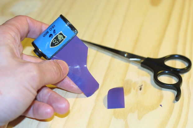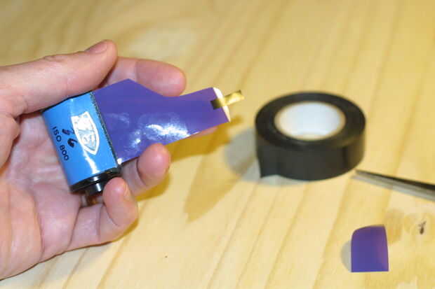 f. Finalmente, usted necesitará una manera para que la película atar a la bobina de recogida en la cámara. Generalmente se agarra a una perforación. He encontrado que sólo un pequeño trozo de cinta funciona muy bien. Cuando se rebobina la película, haz chupada la cinta en la lata, así que tienes que recordar pelar apagado cuando está cargando sus carretes en desarrollo.