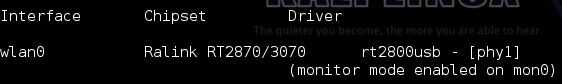 {Si no salida igual que la imagen vuelva a su adaptador de WiFi, si usted todavía no recibe la salida entonces lamentablemente su interfaz inalámbrica no soporta el modo de injection(monitor).