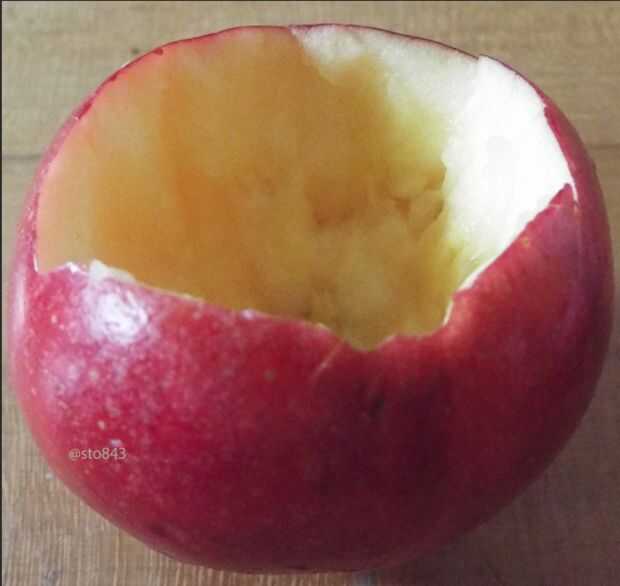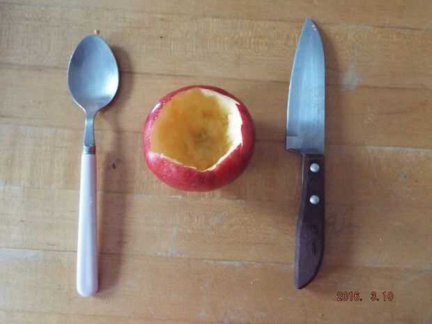 Ahuecar una manzana. Poner la sidra de manzana, una cuña de limón y una ramita de canela en él.