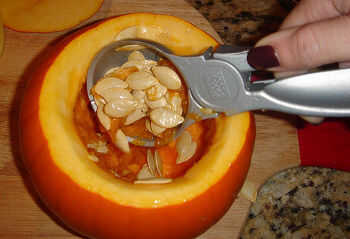 Punta: Pala la calabaza con una cuchara de helado o una cuchara buena. Luego ir sobre ella con un tenedor para obtener los bits de fibrosos. Me gusta realmente despegue de la pared del interior por lo que es más fino para el corte.