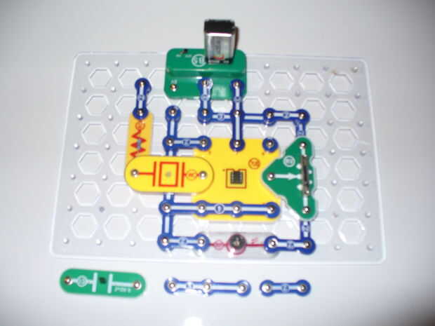 Una vez que construir el circuito, encender el bloque B5. Usted escuchará un tono de la viruta del silbato. Mueva el control deslizante en la resistencia Variable (RV) y se escuchará el tono de subir y bajar en dependiendo de cómo se mueva el control deslizante de pitch. A continuación mueva la mano que proyecta una sombra sobre la resistencia fotosensible (RP) y escuche el tono cambia.