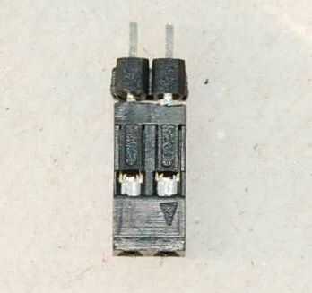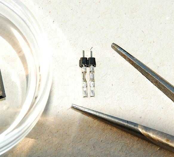 Pero esta vez tuve que tirarla: yo sólo doblado las dos clavijas más cerca juntos un poco (con un par de pinzas), hasta que ya no eran absolutamente paralelos. Ahora, al resbalar en el conector con los conectores, ya no se ajusta perfectamente, pero se filtró con suficiente fuerza que fricción los pernos en su lugar como un conector de resorte--por lo menos hasta poner en el tubo del encogimiento, que va a hacer más esfuerzo, ya que es el elemento de sujeción real (ver más adelante).