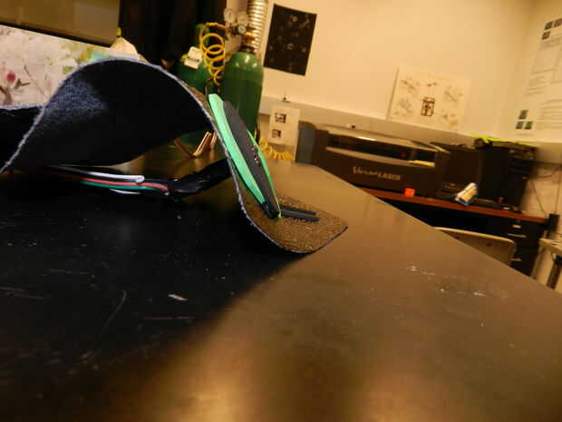 Antes de la marioneta fue cosida enteramente para arriba, los ojos y sensor de luz tuvo que ser instalado. El sensor ligero se colocó en el techo de la boca y los ojos fueron colocados en la mitad superior de la cabeza. Los cables de ambos funcionaron a partir en la mitad superior de la cabeza a través del cuerpo (en la parte exterior de la marioneta interna) a la ONU y el escudo de MP3 en la parte posterior del cuerpo. La ONU y el escudo de MP3 se hacen accesibles en la parte posterior por una franja de velcro en un lado. Este velcro también permite que los cables USB y auriculares salir de la marioneta.