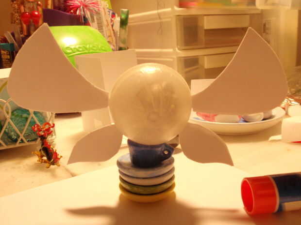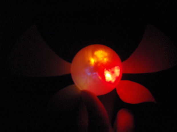 tomó un poco de tiempo a hacer (tuvo que dejar cada capa y el encolado final), pero creo que resultó muy bien :) LED de LED Elemental, pegado en el interior y por cable a través de los agujeros traseros las alas son tres capas de papel que se conectan a través del centro de la bola de plástico cubierto de pintura glo :)