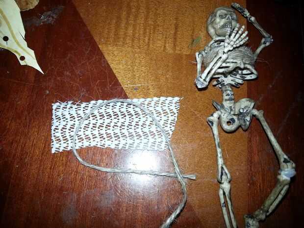 Envolver algunos cordeles alrededor de la caja torácica del esqueleto como una tapa.