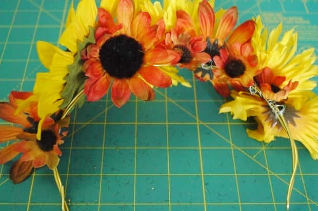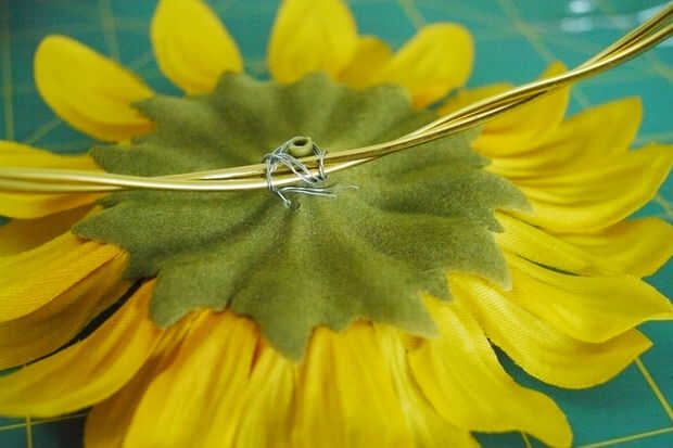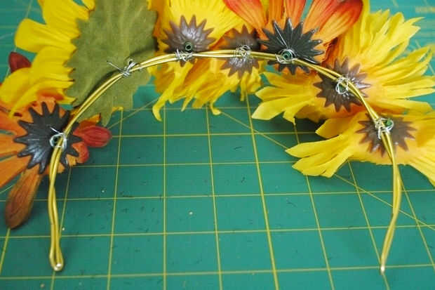 Agregar las flores a la cinta tirando el alambre fino "tallos" a través de las aberturas en el alambre grueso de la "diadema". A continuación, tuerza el alambre delgado alrededor, envolviendo firmemente y asegurando los extremos con unos alicates.