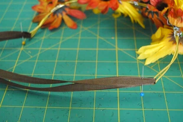 Una vez satisfecho con el arreglo floral, añadir cinta en los extremos de la cinta para atar alrededor de su cabeza. Cortar dos tiras de cinta, una para cada lado; anudar la cinta en su lugar a asegurar. Asegúrese de que medir lo suficiente como para que tengas suficiente cinta para atar alrededor de su cabeza y atarla en un arco con mucha sobra!