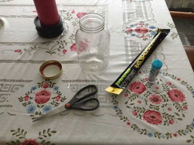 Primero necesitas un tarro tijeras un palillo del resplandor y brillo