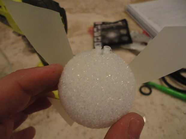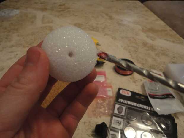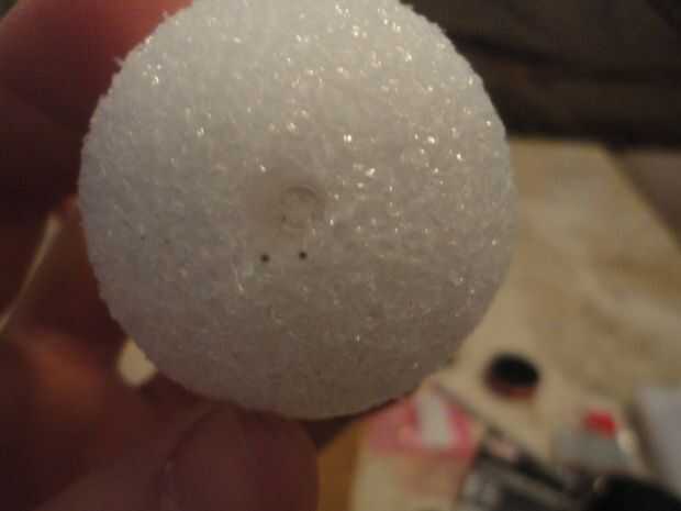 Lo primero que queremos hacer es construir el hada. Coge uno de los 2" esferas y taladro/poke/tallar hacia fuera un agujero justo lo suficientemente grande como para que su LED para adaptarse a. Intente que sea lo suficientemente profunda como para que las LED que se sienta cerca de la mitad de la espuma (por ahora). Si tienes un taladro de 1/4", es perfecto. (IMG 1 y 2) De lo contrario, puede utilizar un destornillador dremel/lápiz/phillips, etc. para hacer el agujero. No poner el LED en sin embargo, sólo nos estamos preparando para más adelante.