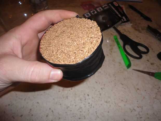 Ahora, con un caliente pistola o super pegamento, pegar el corcho a la espuma. Después se seca, tomar algunos cinta aislante y abrigo alrededor de los bordes de la espuma varias veces para ocultar la espuma blanca. Usted podría también utilizar cualquier tipo de cinta de color, o incluso pintar la espuma un color parecido al corcho, cualquiera que sea su preferencia, el objetivo es sólo ocultar la espuma. (IMG 4) Mi corcho era realmente demasiado alto la primera vez que hice mía, así que corte por la mitad, y ahora tengo dos tapones de 1/2 pulgada de alto.