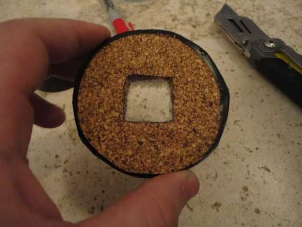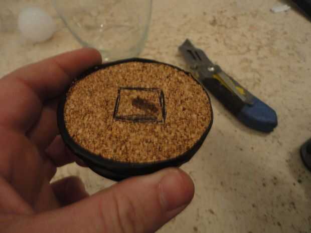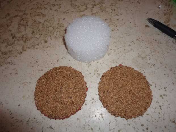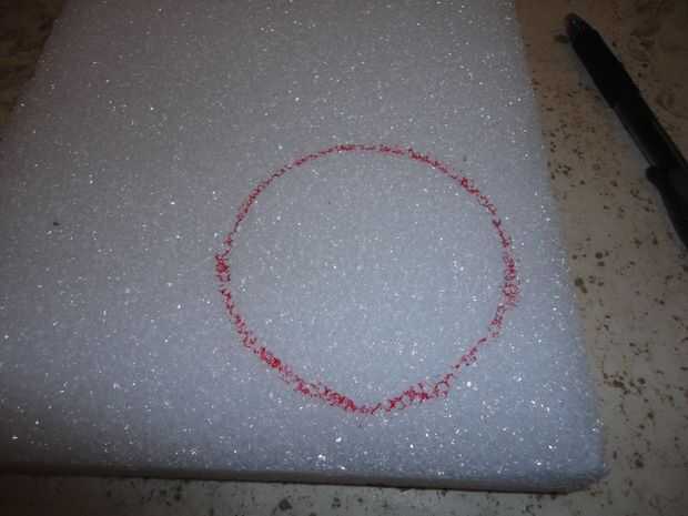 Medir cuán grande debe ser el "corcho". Una manera fácil es encontrar algo que sea del tamaño correcto. Trate de rollos de cinta, posavasos, tapones de botellas, etc.. Apenas cualquier cosa circular, hasta que encuentre algo es el tamaño que la tapa tiene que ser. (IMG 1) En realidad utilicé 3" agujero vio, así que si tienes uno de esos, debe ser perfecto. Una vez que encuentre la plantilla de tamaño adecuado, trazar sobre la hoja de la espuma de poliestireno. (IMG 2) Lo mismo sobre la hoja de corcho. Usted puede hacer dos de estas si usted quisiera, uno para la parte superior de la espuma y uno para la parte inferior, pero la parte superior es el único importante. Básicamente estamos haciendo un corcho falso. Usando un exacto cuchillo/utilidad hoja/sharp cuchillo/sierras, corte los agujeros que usted sólo trazado. (IMG 3)