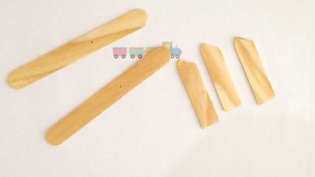 Usar el palito más grande, un agujero en cada 2 barras en la posición como la de esta foto. Tomar algunas otras garrapatas y cortar 3 de ellos en estas forma.