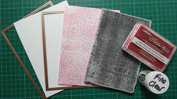 Con #7 halos Baiscs B cortar otra capa y sello en tinta de Coral cautivador. Espolvorear con polvo de grabación en relieve clara y mano cortar un panel de tarjeta plata sentarse entre estas capas de calor