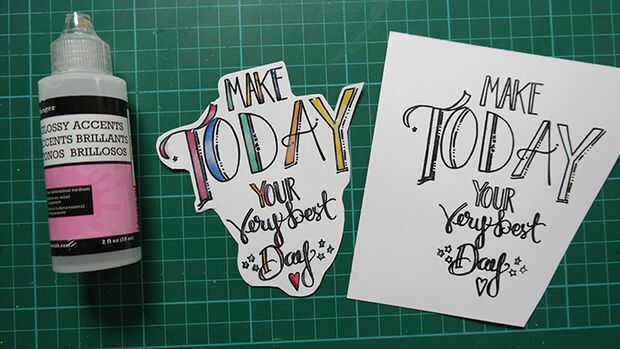 Sello de calor realzan las palabras con polvo claro y color utilizando un color diferente para cada letra. Cubrir las palabras con acentos brillantes y dejar de lado que se seque