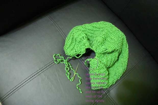 Ahora medir por lo menos 24" cola de hilo desde donde acabaste y corte el sobrante. Ahora poner la cola a través del hilo aguja y el hilo a través de todos los lazos. Hacer que deje un aro. Véase el cuadro 4. Ahora apriete la última fila, pero deje suficiente espacio para que hay un agujero del tamaño de tu pinky. Atar los dos extremos.
