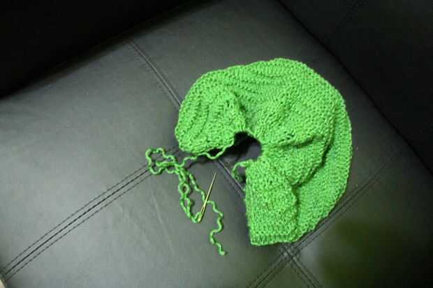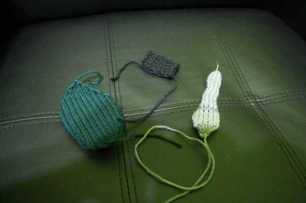 La rotula junto uno de lo tallo y la hoja. Coser en ese extremo en el orificio de pinky tamaño que lo dejó en la parte superior.