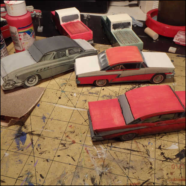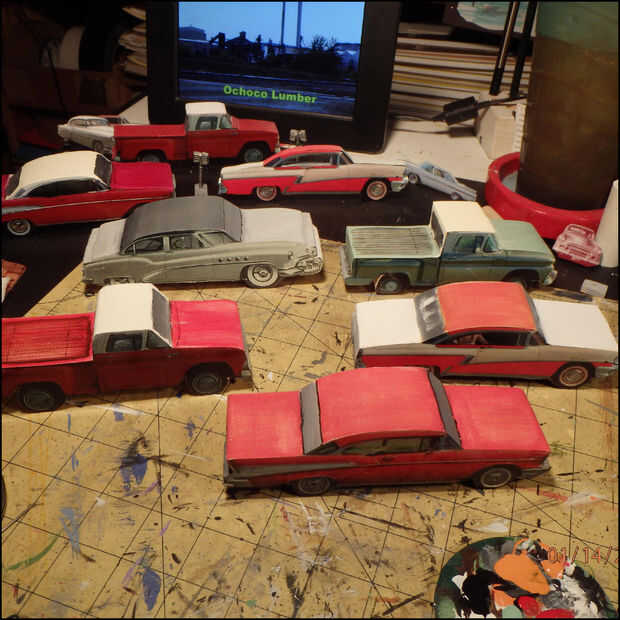 ¡ Ajá! El último paso es pintar los coches para que coincida con los colores de las fotos. Usé pintura acrílica ya es lo que tengo y viene en muchos colores para emparejar el color no es un problema. Un cepillo de pintura de línea fina se utiliza para línea de ventanas, faros, parrillas, parachoques, etc.. No tienes que ser exacto, como la mayoría de los modelos estará vistas laterales. Después de que la pintura haya secado completamente, aplicar acrílico de poli uretano. Nuevamente, se seca muy rápido, y después de un lijado ligero, se pueden agregar más capas.