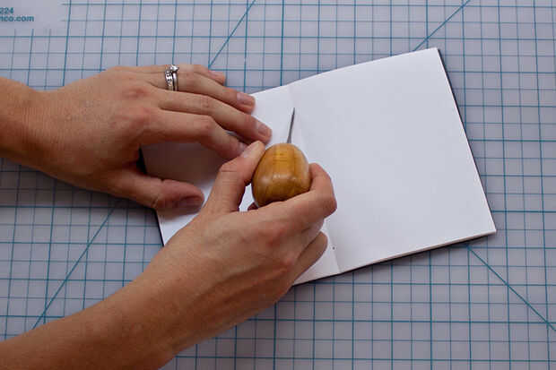 Coloque el papel de la impresora dentro de la tapa y, con la lezna, meter tres agujeros en la columna vertebral: una en el centro y una cerca de dos pulgadas desde el centro del agujero a cada lado. Si no tienes un punzón, puede utilizar la aguja o un cuchillo x-acto para meter estos agujeros. Tenga cuidado de no cortarse con la lezna y x-acto; ambos están muy afiladas!